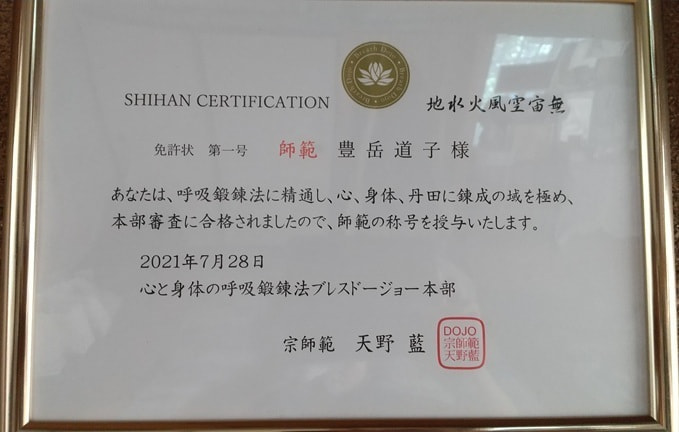豊岳道子 師範授与証、及びDOJO認定証